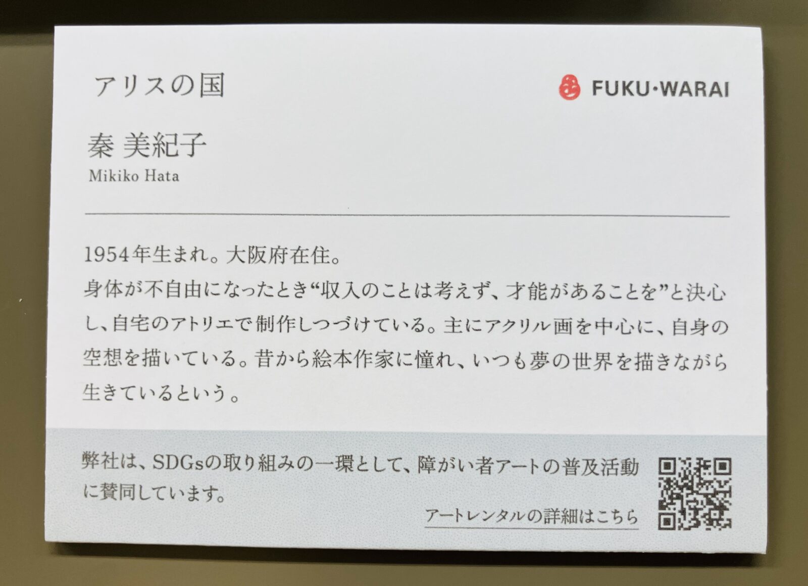 当社は「五方よし」の経営方針のもと、社会貢献活動の一環として、一般社団法人FUKU・WARAIによる障がい者アートレンタルを活用し、オフィス内に作品を展示しております。