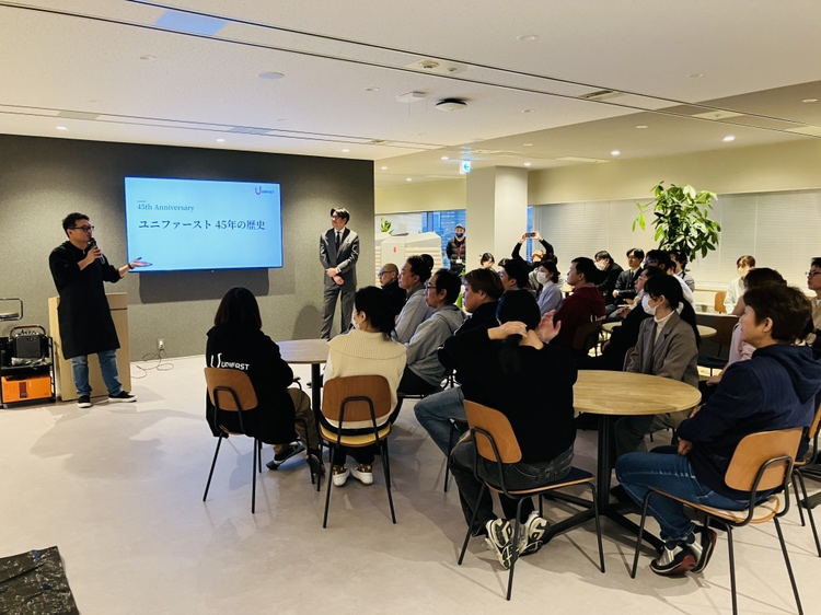 また、「ユニファースト45年の歴史」と題した講演では、創業から現在に至るまでの挑戦の歩みを振り返り、会社の価値観と未来へのビジョンを改めて全員で共有する機会となりました。さらに、ダンスパフォーマンスやマジックショーなども催され、部署や世代を越えた交流が生まれる場となりました。